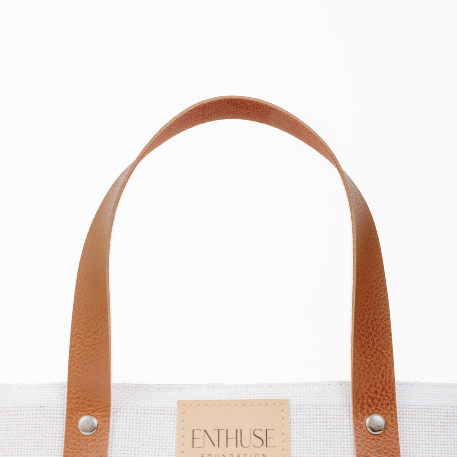We’re bringing woman-owned brands to market and now you can, too. Our top-handled laminated jute market bag features an internal pocket, leather patches, and a durable design.